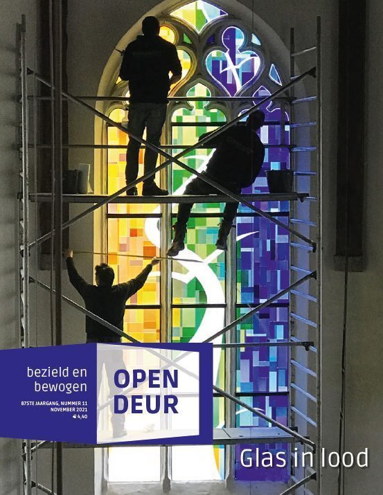 ‘De transparantie en de manier waarop het licht er doorheen valt. Het verandert ook met de verandering van de lichtinval. Bij een schilderij heb je een verzadiging in kleur, maar als je een glasraam hebt, is er variatie in kleur bij verschillend licht. Door de transparantie van glas zit er leven in.’ Zeker in het glas dat Hermine gebruikt, want dat is mond geblazen ‘echt antiek glas’. Dat glas heeft luchtbelletjes en structuur erin: ‘De niet-egale structuur die ontstaat bij het mondblazen maakt dit soort glas spannend. Als je er schuin doorheen kijkt, is het anders, leeft het meer en doet het licht zijn werk.’ Ze gebruikt het eigenlijk altijd. Veel kerkelijk glas is mond geblazen glas, waarop gewerkt is met brandschildering.