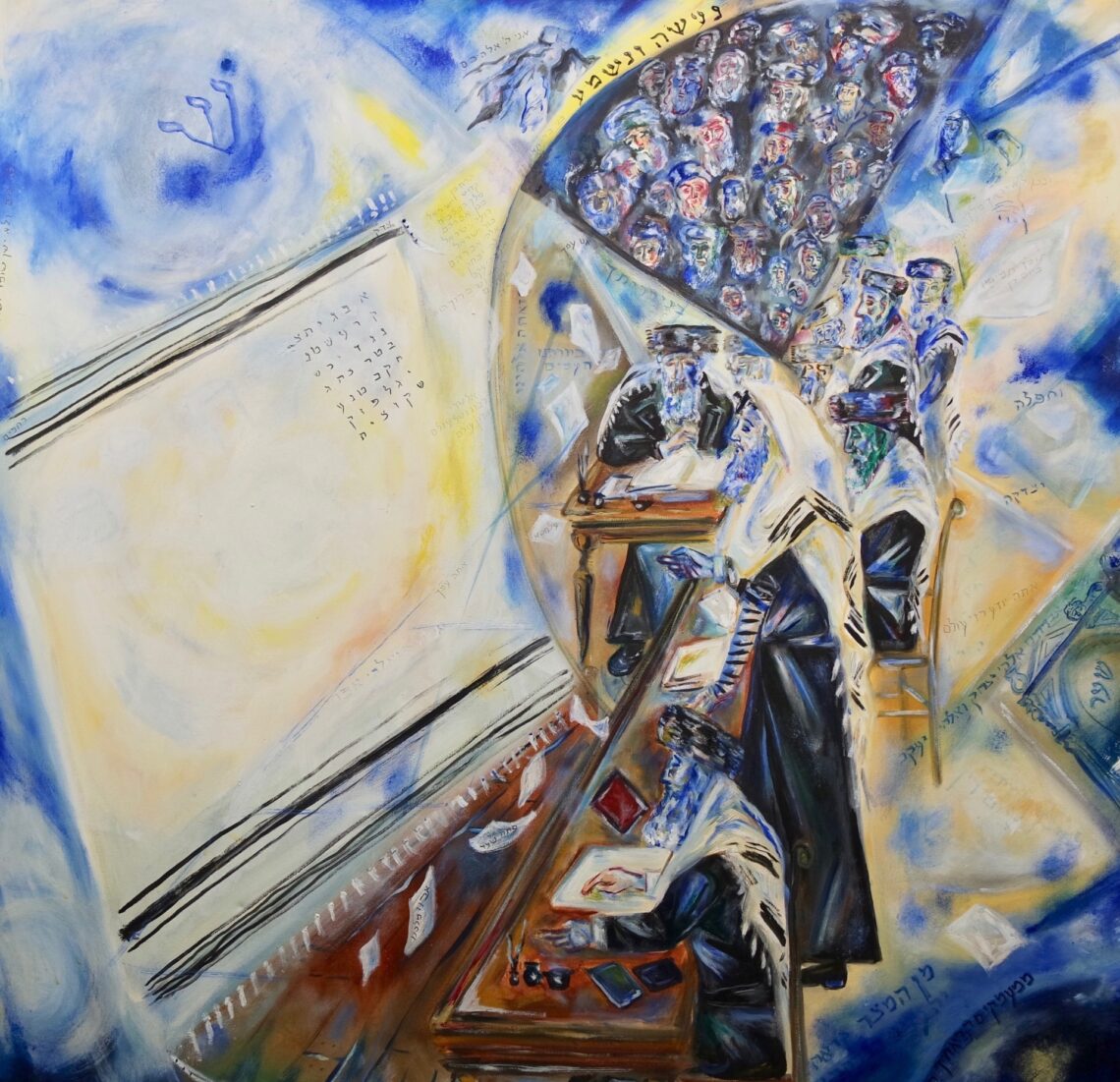 En kijk eens aan! Een poosje later arriveerden er grote volle graanschepen in de haven. De hongersnood was voorbij! Was dit hoogmoed, overmoed, een gotspe, of was deze rechtszaak simpelweg een bewijs dat een Jood alles kan en mag opgeven behalve hoop? Dit verhaal circuleerde uiteraard in de hele chassidische wereld en daarbuiten. Een paar eeuwen later heb ik deze rechtszaak geschilderd. Dat leverde een paar hoofdbrekens op, want hoe verbeeld je God in de beklaagdenbank? Ik koos ervoor om voor de beklaagdenbank een gebedsdoek te hangen, en veel zaken uit te drukken met teksten. Het artikel (in het Engels geschreven) hoe dat allemaal is gedaan, vindt u hier en daar.