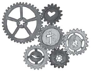 Dat is ook de boodschap van de afbeelding die Van den Berge en Van der Meulen in hun artikel plaatsen: Christus staat centraal. In de Nederlandse uitgave hebben we gekozen voor een andere tekening. In deze tekening staat het kruis centraal, de andere waarden staan eromheen als tandraderen die in elkaar grijpen: de waarden hangen met elkaar samen en kunnen niet van elkaar worden losgemaakt.