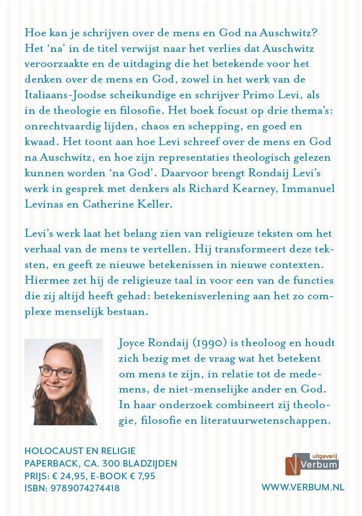Joyce Rondaij (1990) is theologe en raakte in de ban van zijn werk. Ze ging Italiaans leren om hem in zijn eigen taal te kunnen lezen. Vorig jaar promoveerde ze op de theologische en filosofische dimensies in het werk van Primo Levi. Dit boek is de vertaling en bewerking van haar Engelstalige proefschrift.